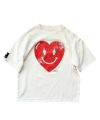 フロントに描かれた愛らしいハートとスマイルにミックスされた攻撃的なハンドサインプリントと、バックのフォントプリントデザインが特徴的。