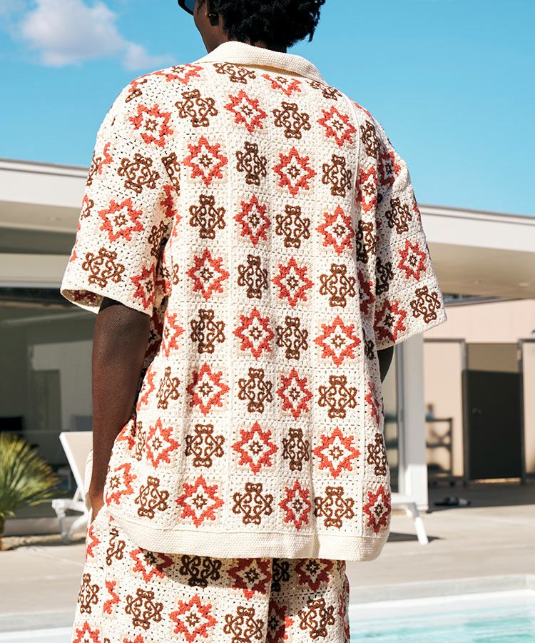 オリジナル柄をブロック状に配置した、クロシェ編みのシャツです。