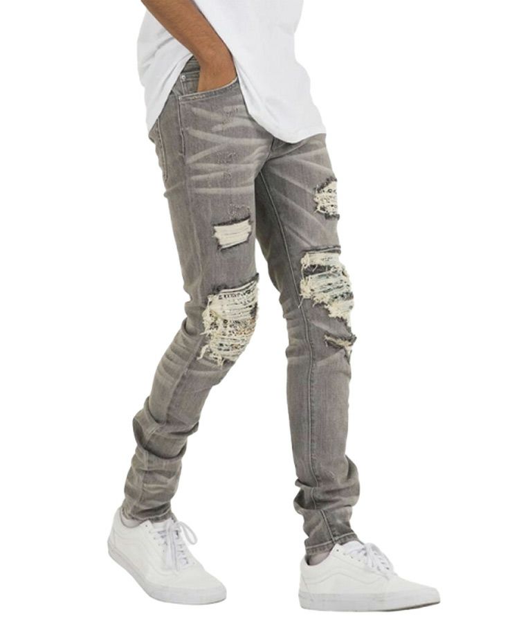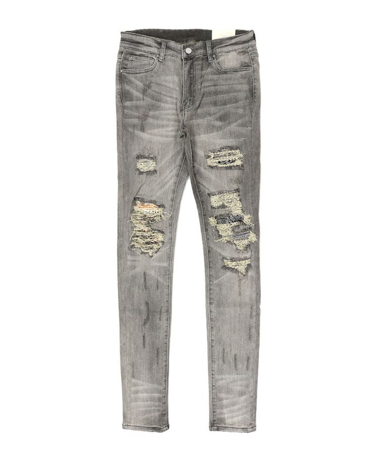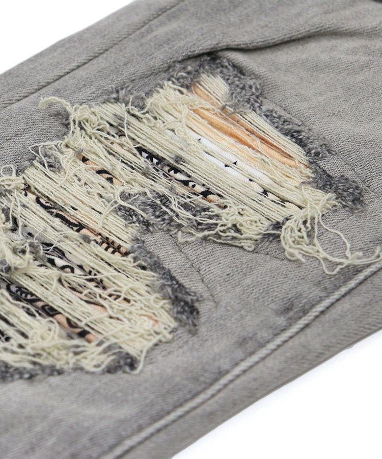 大胆にダメージ加工を施し、ダメージを補修するように当てられたピンタックのペイズリー柄の生地が印象的な仕上がり。