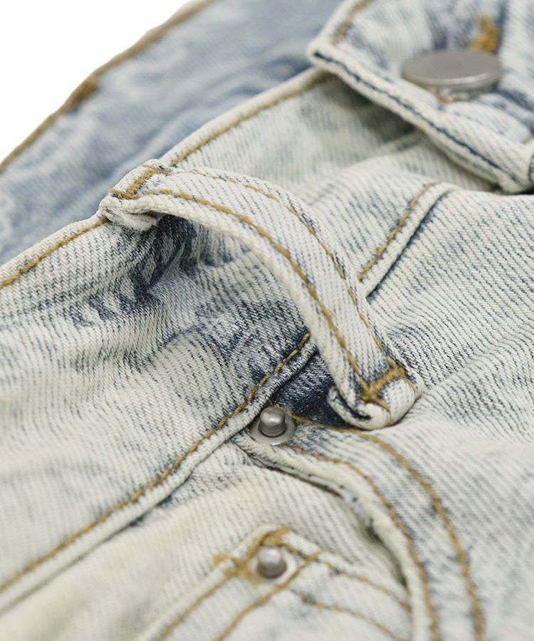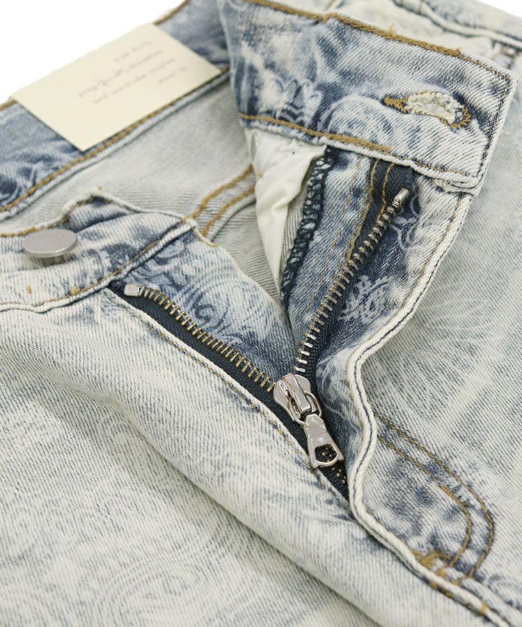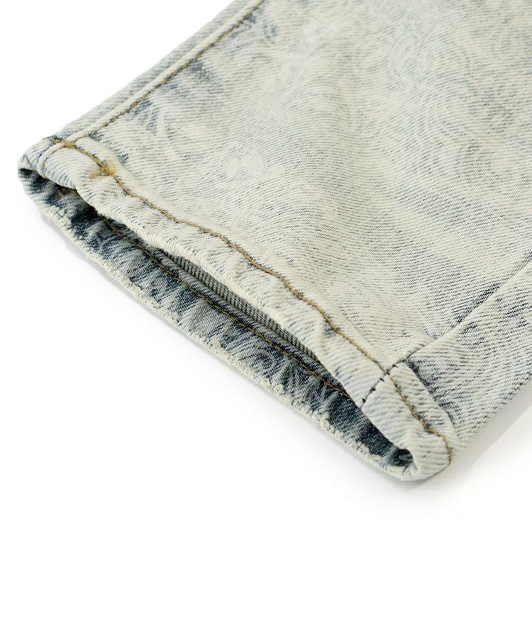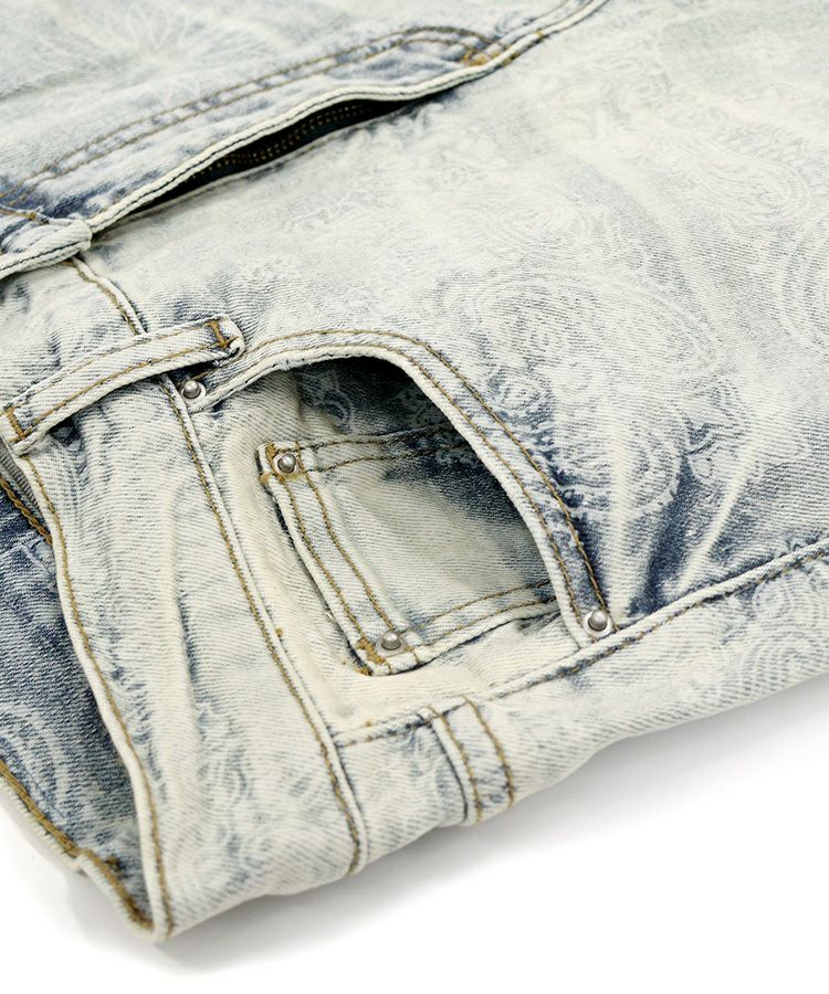 スタイリッシュなヴィンテージウォッシュ加工とペイズリー柄を掛け合わせたインパクト抜群のライトブルーデニム。