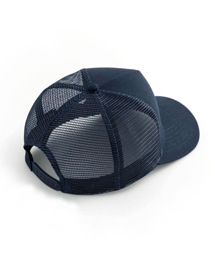 深みのあるネイビーカラーに、通気性に優れたプレミアムメッシュバックを組み合わせた、5パネル仕様のトラッカーハット。