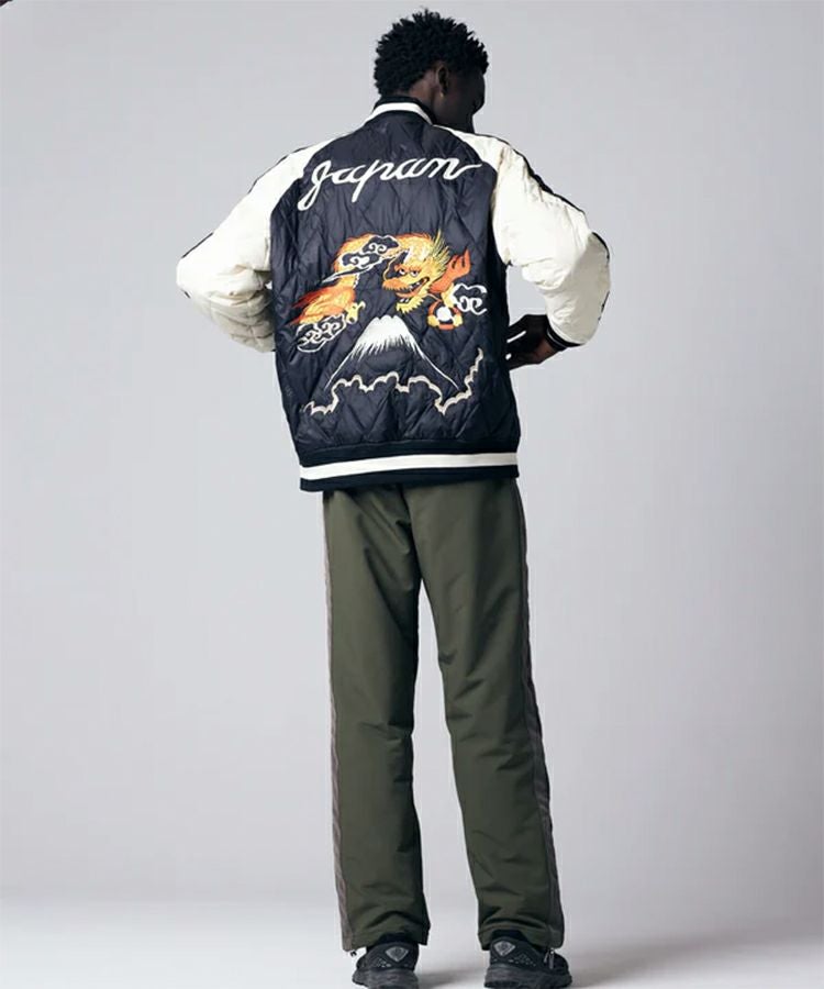 スカジャンとダウンを組み合わせた、スカジャン風リバーシブルダウンジャケット。