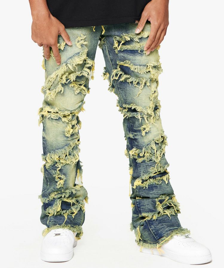 大胆なダメージ加工が施された共生地デザインが特徴的な一本。