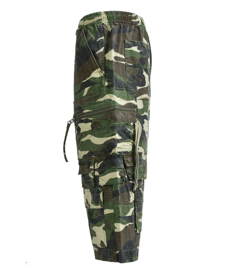 コットンリップストップのウッドランドカモ生地を使用したクロップドカーゴパンツ。