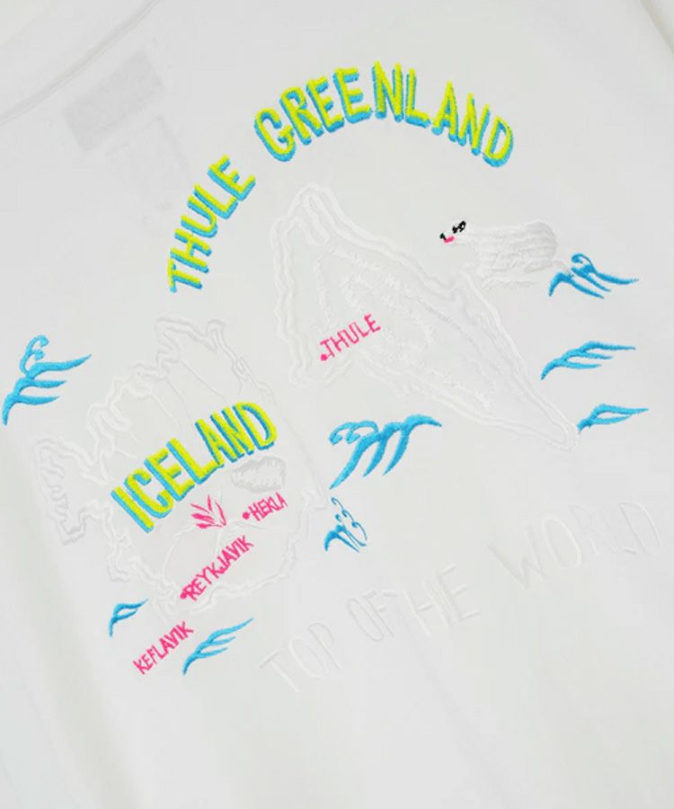 ICELANDとGREEN LANDの伝統的なスカジャンの刺繍をミックスし、インパクトのある図案に仕上げています。