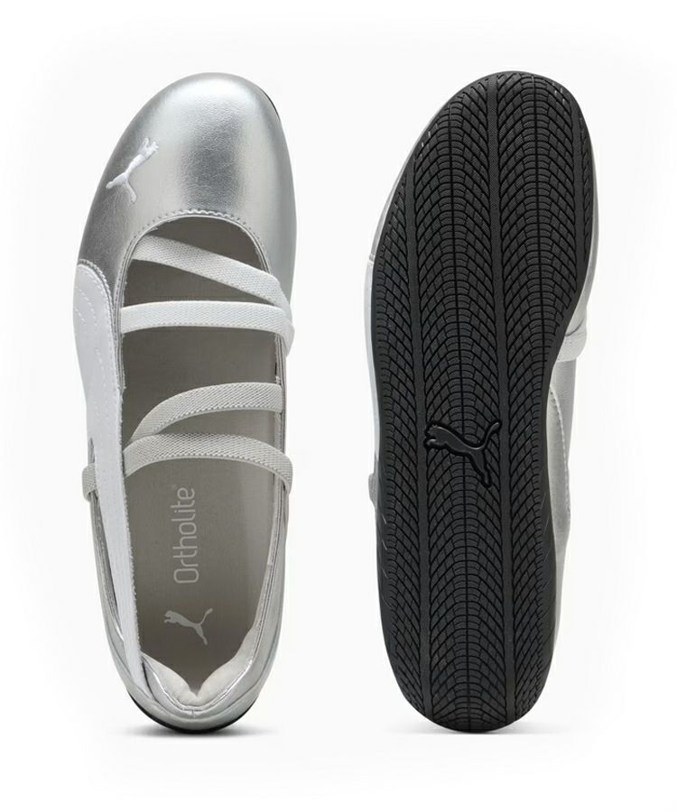 バレエからインスパイアされたエレガンスさと元来のレーシングDNAを融合させたスピードキャットバレエは、スウェードのアッパー、刺繍のプーマキャット、ぴったりとフィットするゴムバンドが特徴です。
