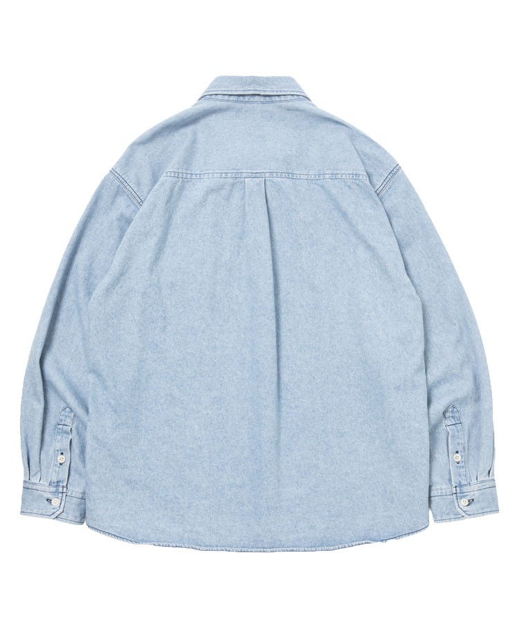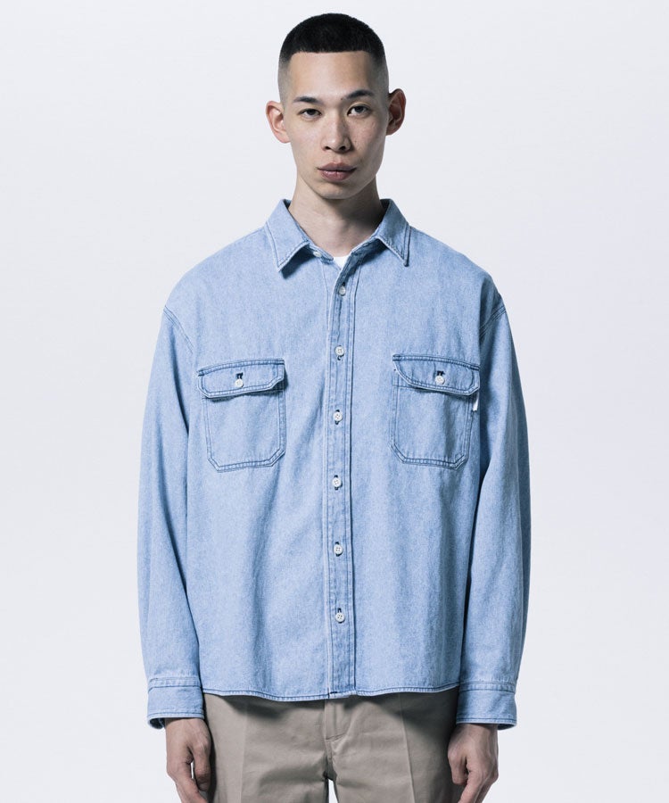 8.5ozのデニム生地を使用したワイドシルエットのレギュラーカラーシャツ。