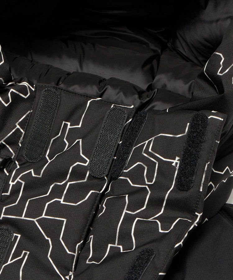 フロントダブルフラップ仕様/内側に二つボトルポケット/ワンハンドアジャスターフーデッド/両胸ポケット止水ファスナー/ダウン入り内衿仕様