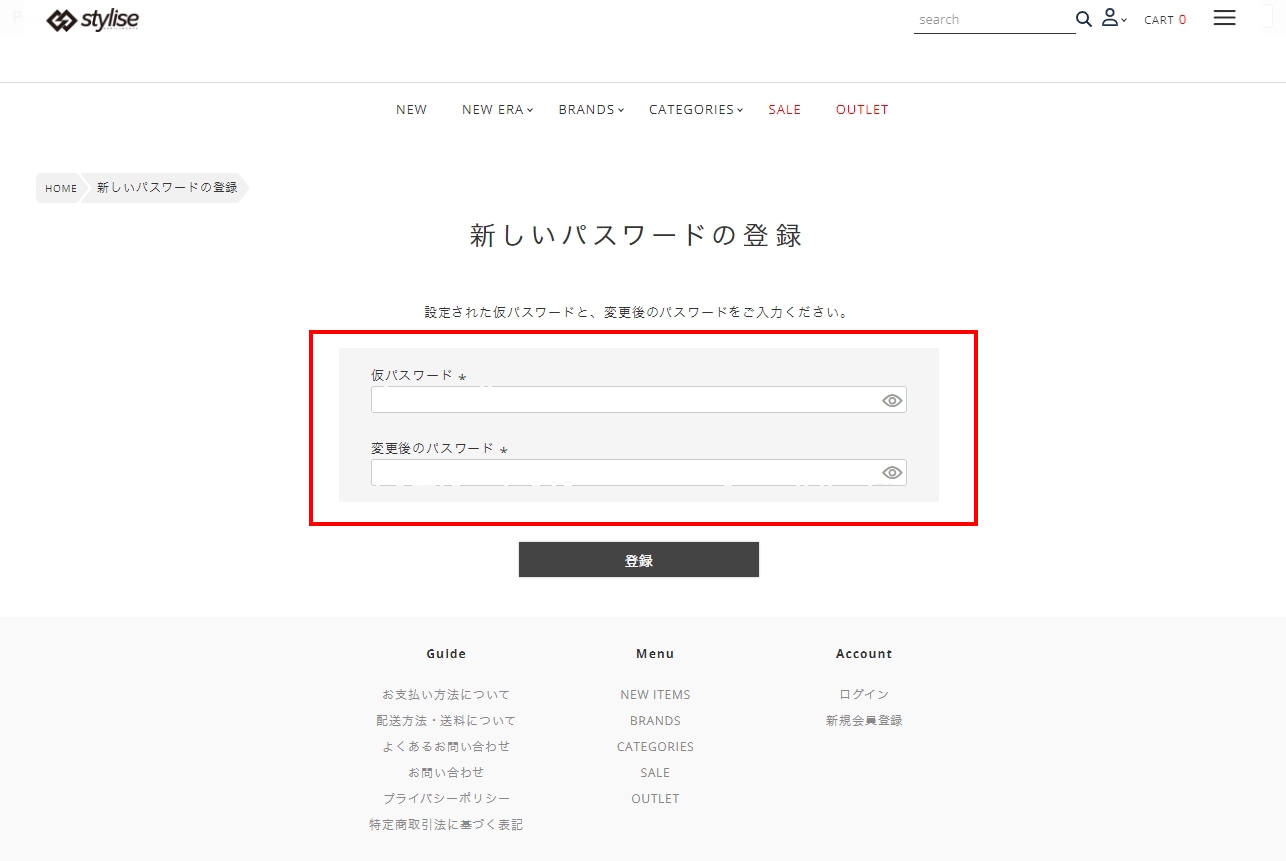 4.【新しいパスワードの登録】ページにて、3.で設定した【仮パスワード】と【変更後のパスワード】(=本パスワード)をご入力ください。※この際、仮パスワードを本パスワードとして設定することも可能です。